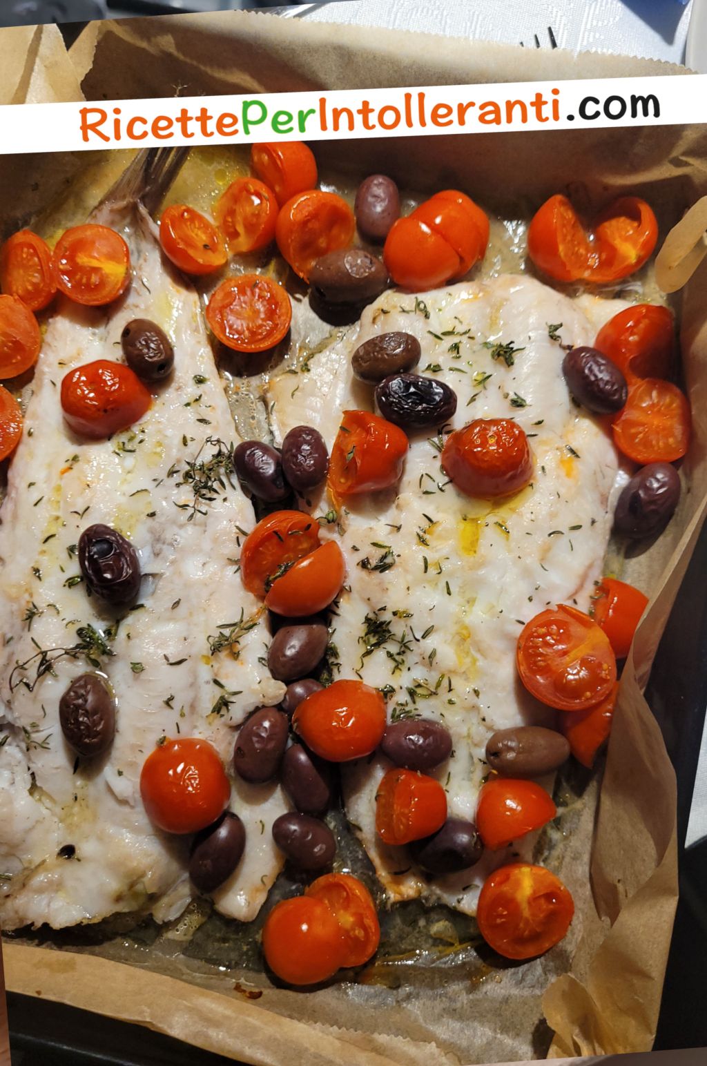 3. Sfornate le orate e servitele sopra un letto di pomodorini, e olive.