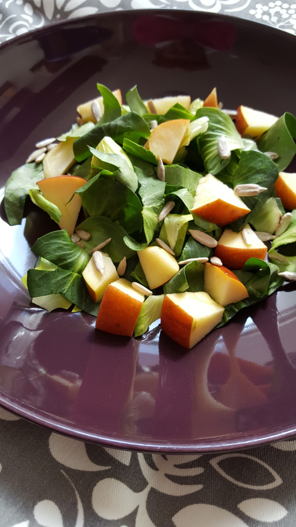 4. Adesso impiattiamo con il cicorino, la mela, i semi di girasole e infine un po’ d’olio.