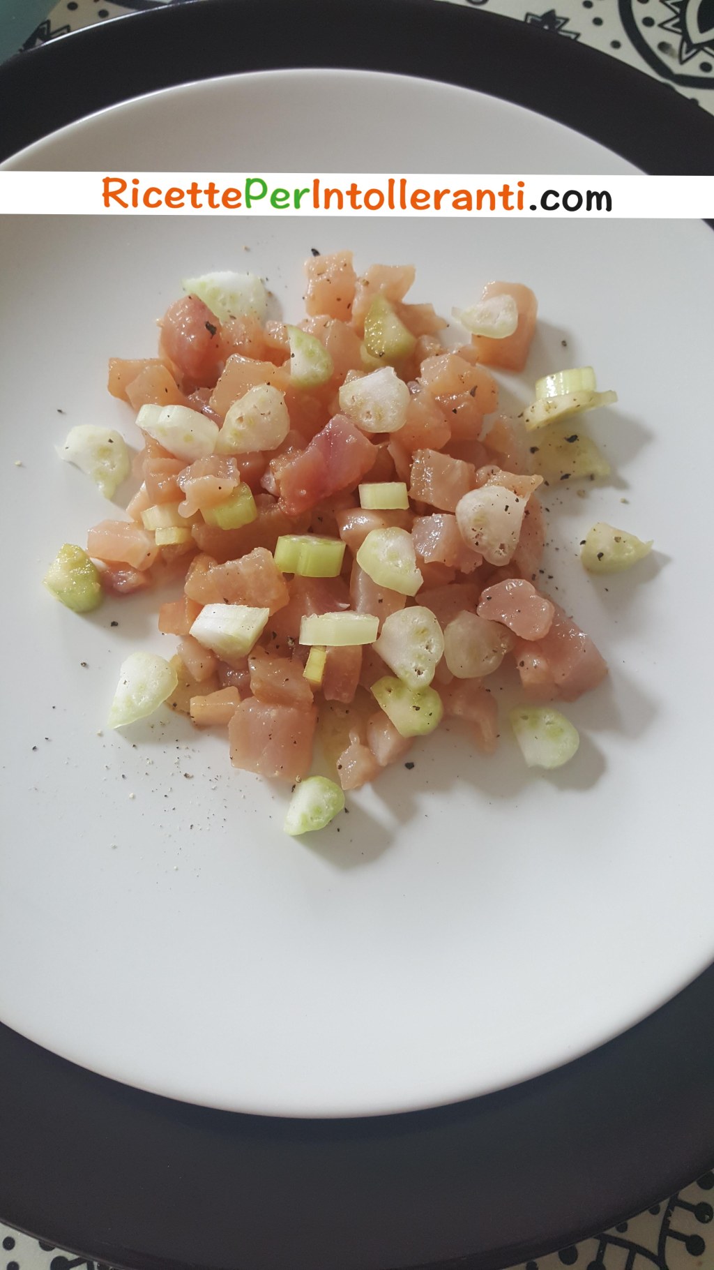 1. Prendete la cipolla di tropea e tagliatela finemente, il sedano lo fate a tocchetti. Poi prendete la tartare di pesce spada (fatta preparare dal pescivendolo) e conditela con un po’ di limone, olio, sale e pepe e un po’ di salsa di soia.