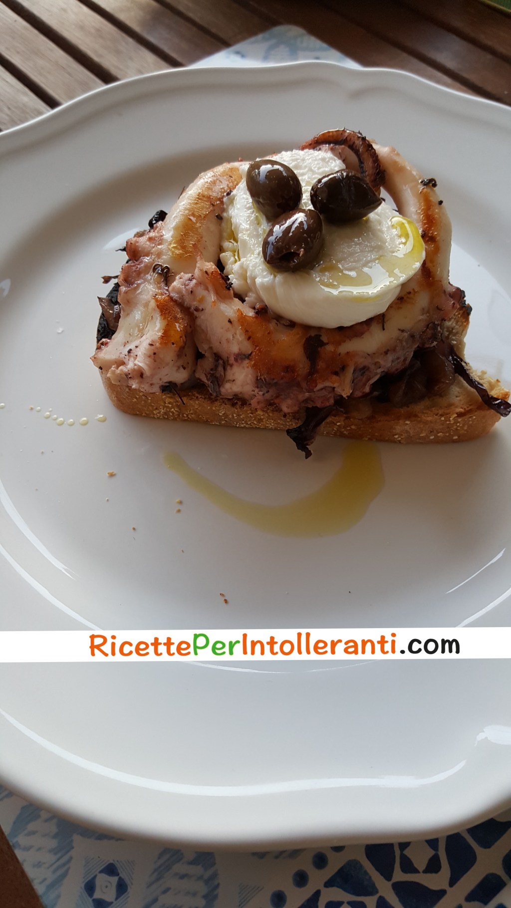 5. Impiattate seguendo: una fetta di pane, il radicchio, 2 gambe di polpo, la mozzarella e le olive taggiasche su cui metterete un filo d’olio (e paprika dolce a piacere).