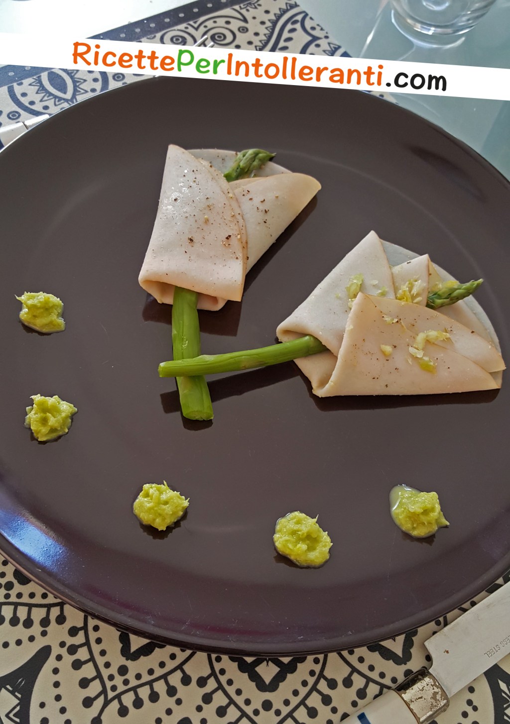 3. Infine impiattate con la fetta di tacchino arrosto cosparsa di salsa di sedano, l’asparago in mezzo e salsina intorno.