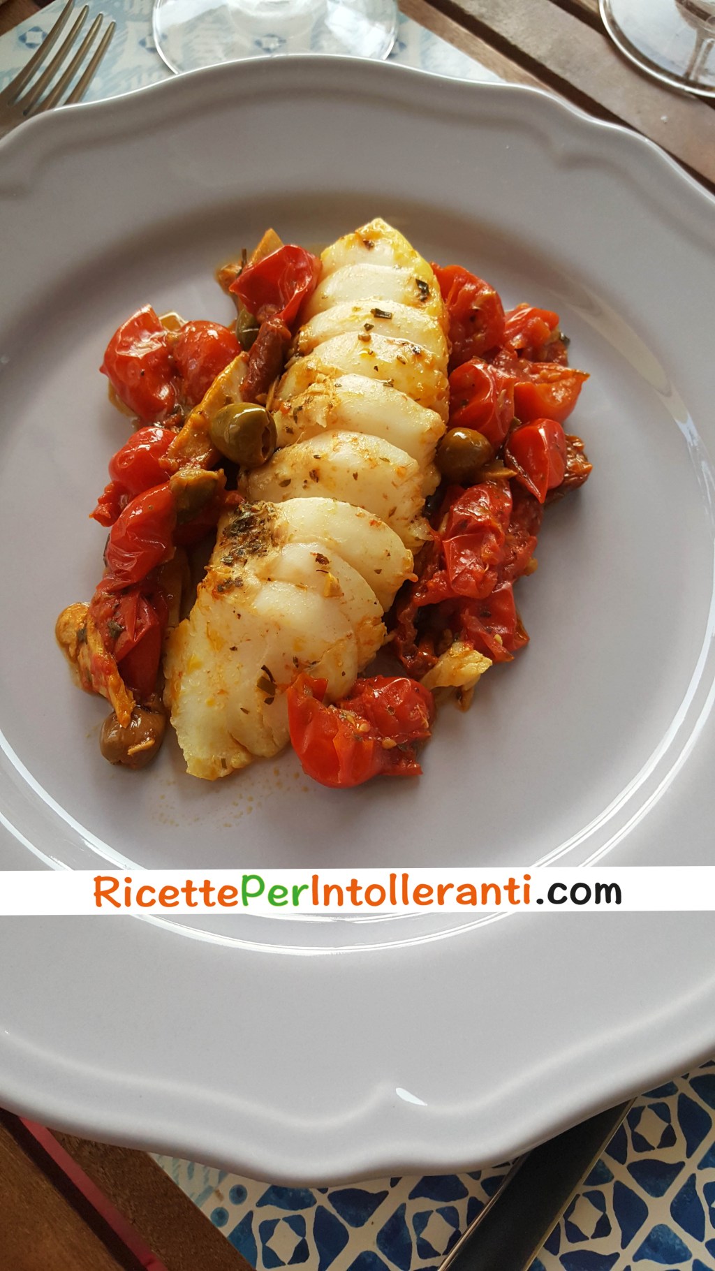 2. Mettete in una padella olio e aglio, aggiungete i pomodorini tagliati a metà, i capperi dissalati, le olive e fate andare per 5 minuti. Quando i pomodori sono un po’ appassiti unite al centro il trancio di merluzzo spolverato di origano. Cuocete a fuoco moderato, unite la curcuma, sale e pepe.