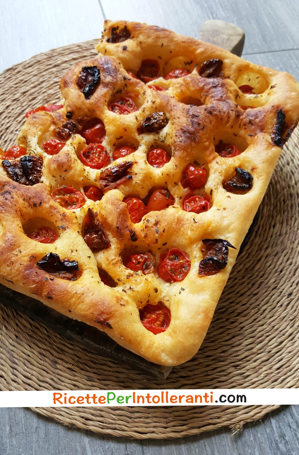 9. Infornate a contatto con il forno e lasciate cuocere senza aprire per circa 12-15 minuti. Verificate che sollevando l’impasto sia leggermente dorato sul fondo. Quindi spostate la teglia a metà altezza e cuocete per circa 6-10 minuti. VERIFICATE CHE NON STIA SECCANDO TROPPO. Altrimenti spegnete prima. Prima di servire togliete la focaccia dalla teglia e disponetela su una gratella per farla respirare, infine aggiungete un filo di olio crudo.