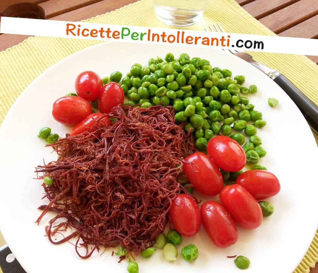 4. Impiattare gli sfilacci, con pomodorini e i piselli lasciando gli alimenti separati tra loro.