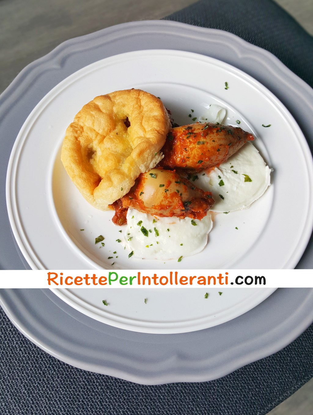 6. Infine, impiattate mettendo un po’ di sughino coi piselli sul fondo del piatto, le fette di mozzarella a temperatura ambiente, adagiate sopra i calamari ripieni a cui avrete tolto lo stuzzicadenti e cospargete con prezzemolo tritato fresco.