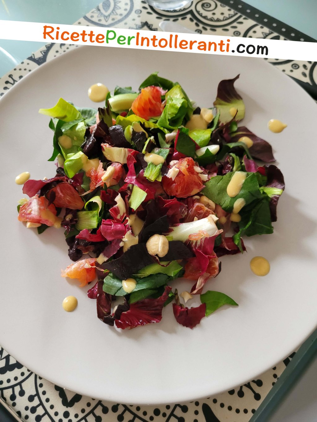 5. Adesso impiattiamo con il cicorino, l’arancia a tocchetti, gli anacardi, un po’ di sale e la salsa preparata facendola cadere a gocce nel piatto.
