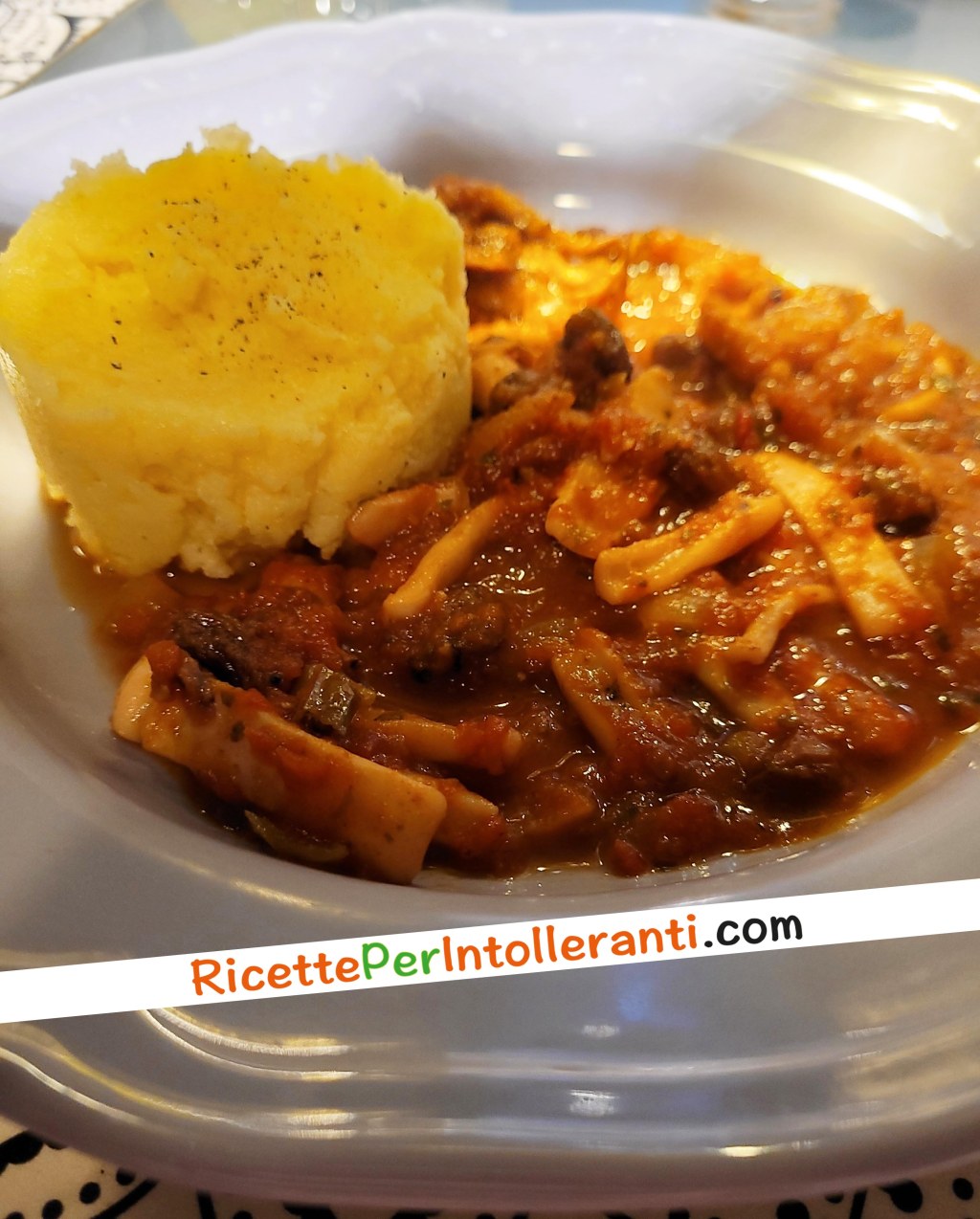 INGREDIENTI: 2 persone700 gr Calamari freschi1 Cipolla bianca2 spicchi di AglioPassata di PomodoroPrezzemoloPeperoncinoSalePepe400 gr di Polenta istantanea DIFFICOLTA’: facileTEMPO: 50 min CALORIE: 550 KCal a porzione
